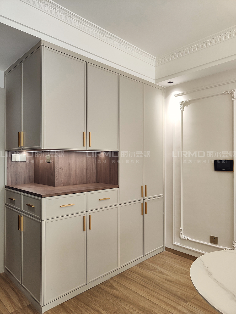 轉(zhuǎn)角玄關(guān)餐邊柜一體設(shè)計(jì),采用模壓造型柜門,將布局利用最大化