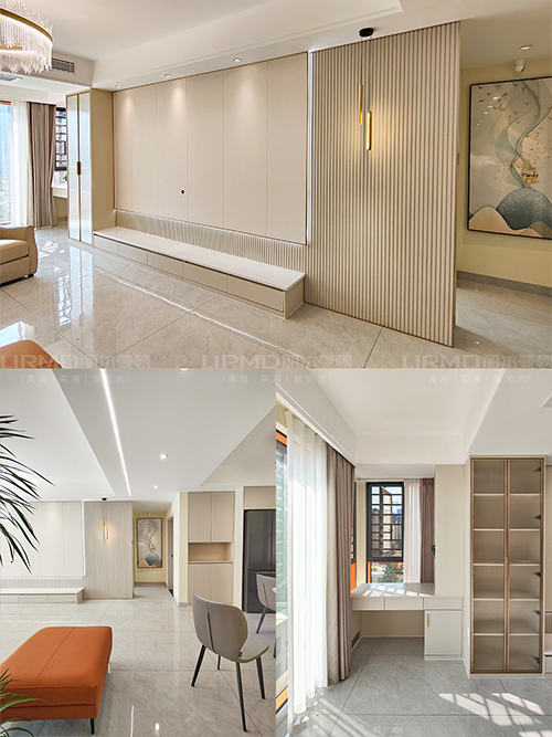 全屋衣柜、櫥柜、房門、護墻板都選用奶咖色系配套。