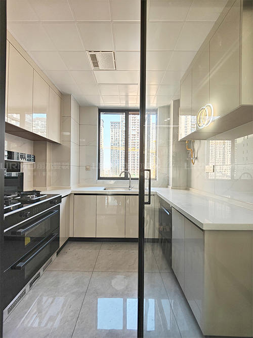 U型廚房兩側選用奶咖色定制高光柜門,有足夠的空間儲納