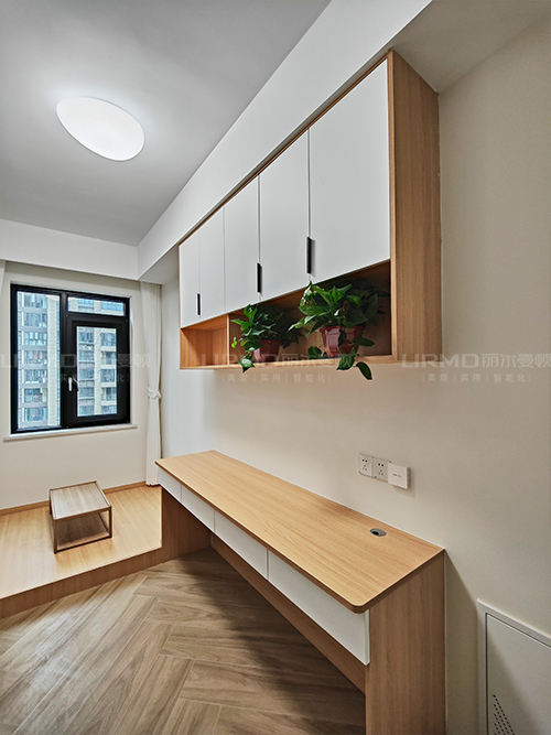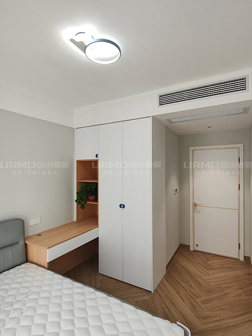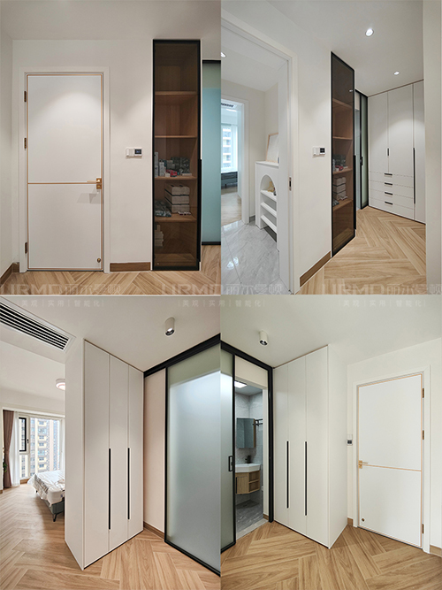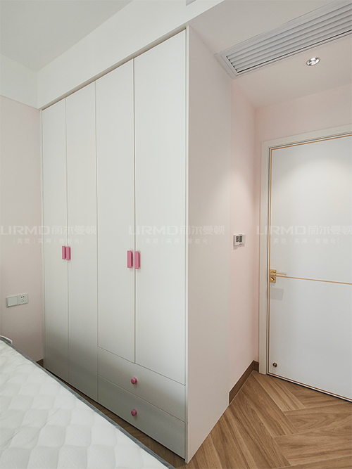 讓整個睡眠區舒適愜意。門邊做內嵌玻璃柜,合理利用空間收納生活必需品