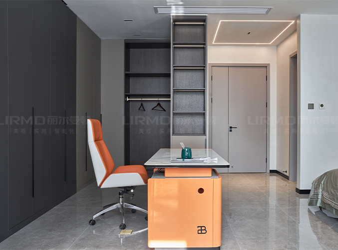 開放式書桌選用橙色椅子點(diǎn)綴,在視覺上體現(xiàn)了整個空間的層次感。