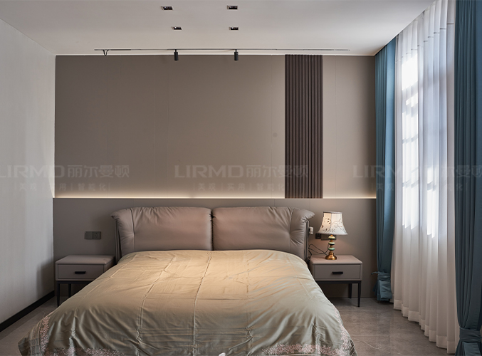 床頭背景墻選用膚感格柵,吊頂無主燈設(shè)計,