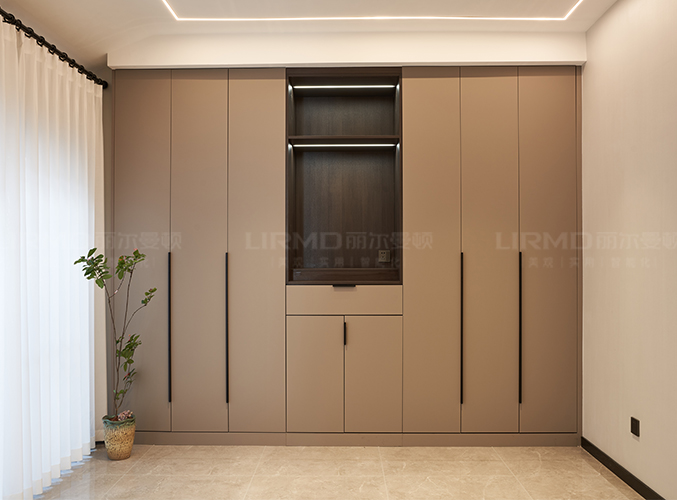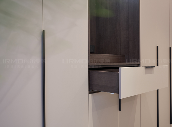 柜門選用膚感PET一門到頂設(shè)計,搭配開放格+抽屜柜