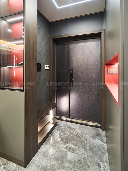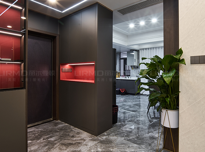 實(shí)木柜體搭配PET膚感柜門,收納更方便,左邊配有實(shí)木鞋架,深色柜門與紅色內(nèi)嵌的碰撞,