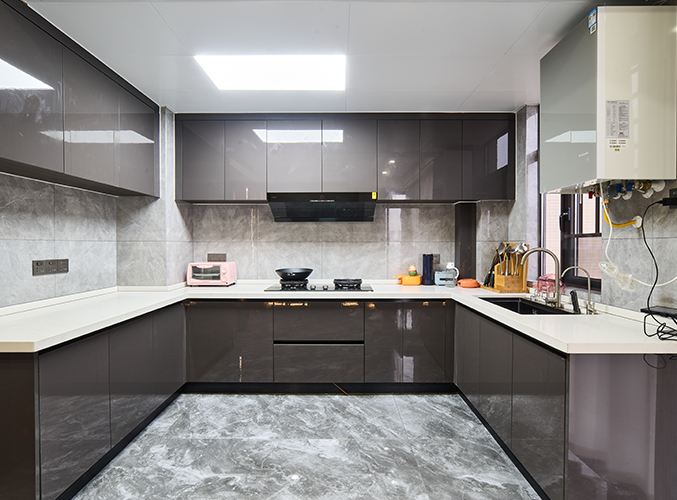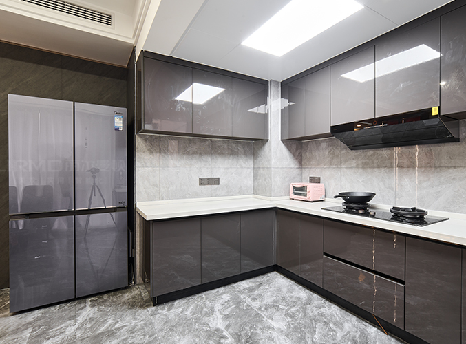 上下方都有收納柜,視覺層次更加豐富,搭配大理石臺(tái)面美觀又實(shí)用,左邊冰箱很好的利用空間,