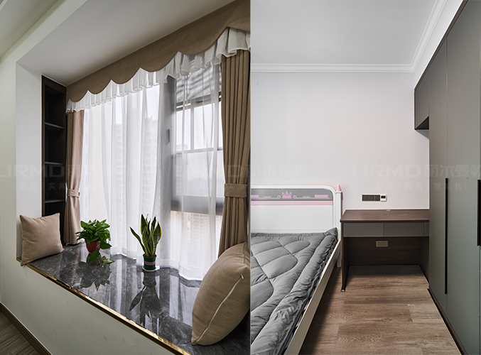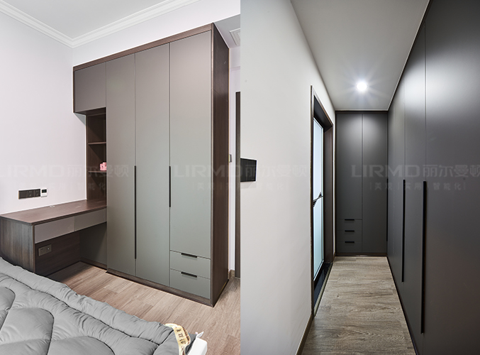 實(shí)木柜體搭配PET膚感柜門,衣柜+床頭柜的組合,收納更加方便,搭配上落地窗榻榻米的設(shè)計(jì),
