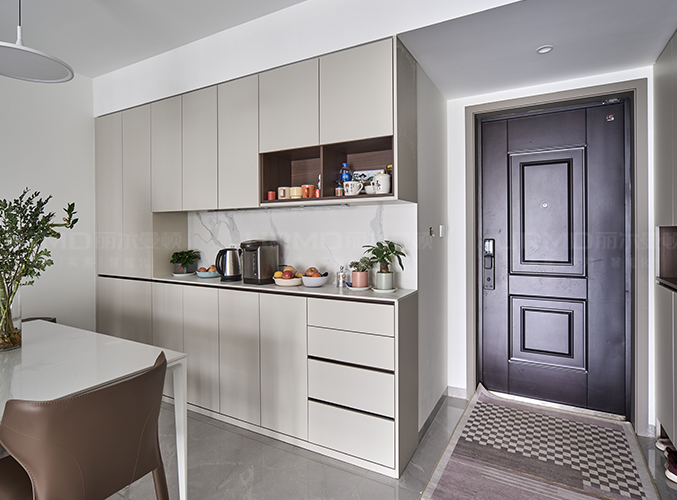 和墻面平齊,不占空間的同時(shí)收納更加方便,右邊通往小孩房的隱形門設(shè)計(jì),