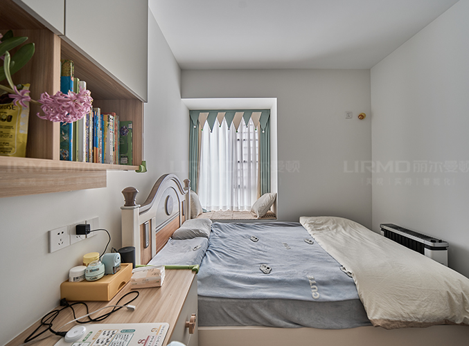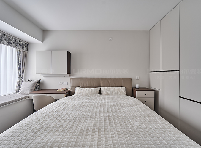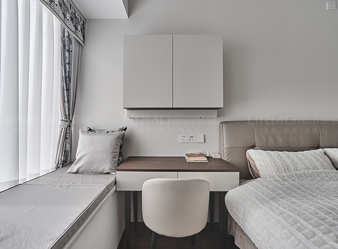 采用衣柜書桌一體設(shè)計(jì),既能儲(chǔ)物又能學(xué)習(xí)。
