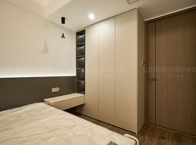 實木柜體搭配PET膚感柜門,一門到頂柜子設計+右側懸空桌臺設計,下方懸空設計,