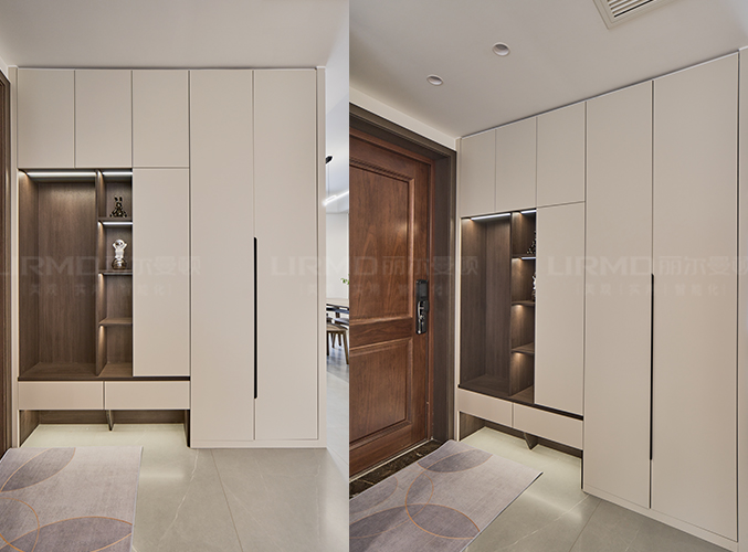 18mm厚杉木芯板,淺色柜門加深色柜體的碰撞,視覺效果更好,既能坐下?lián)Q鞋