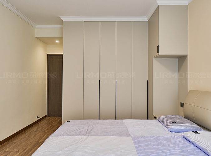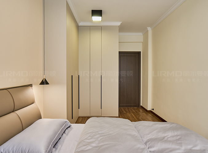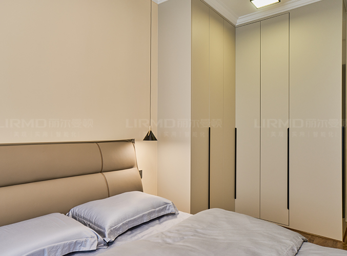 柜子一門到頂設(shè)計,實木柜體搭配PET膚感柜門,床邊搭配暖色系吊燈,