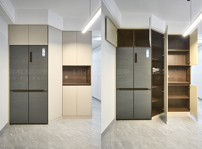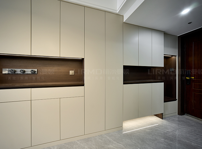 18mm厚杉木芯板,入戶鞋柜+餐邊柜的設計,大大提升了收納空間,鞋柜下方懸空設計,