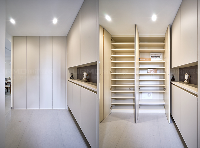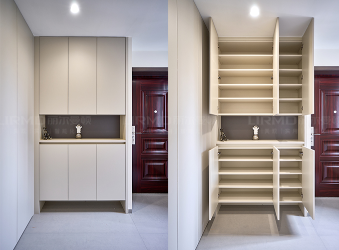膚感鞋柜+一門到頂無拉手設計,柜墻一體化盡顯極簡之美。