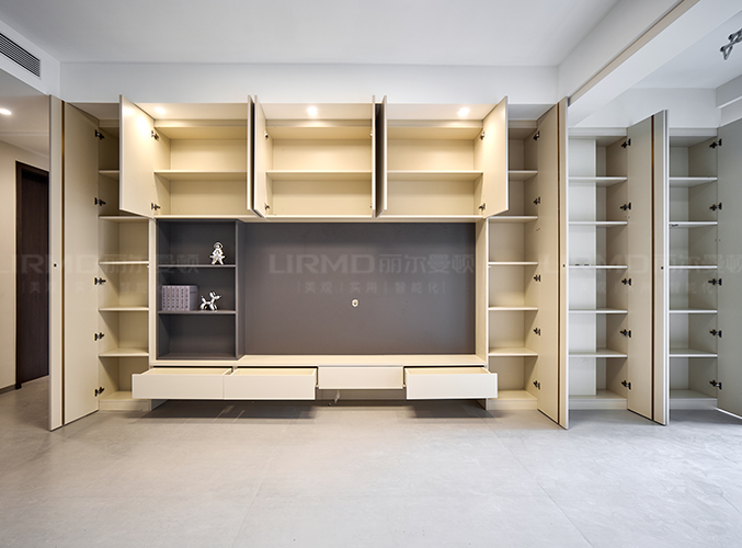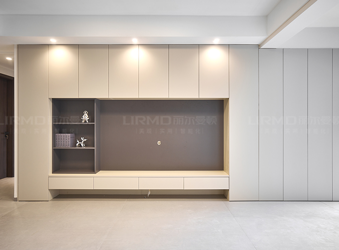 整屋通鋪瓷磚,盡顯大氣,電視背景墻采用整面墻做柜子設計,超大收納空間儲物更方便,