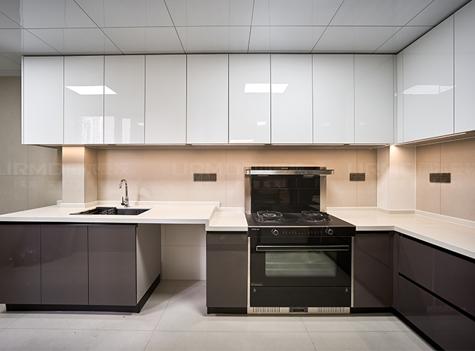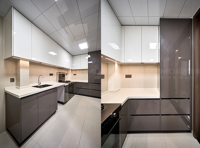 L型櫥柜超晶飾面美觀易打理,吊柜下內嵌燈帶照亮主燈死角,烹飪更舒心。