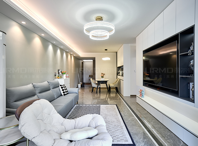 整屋通鋪瓷磚,盡顯大氣,整墻電視背景墻設計,右邊和下方內嵌式設計,