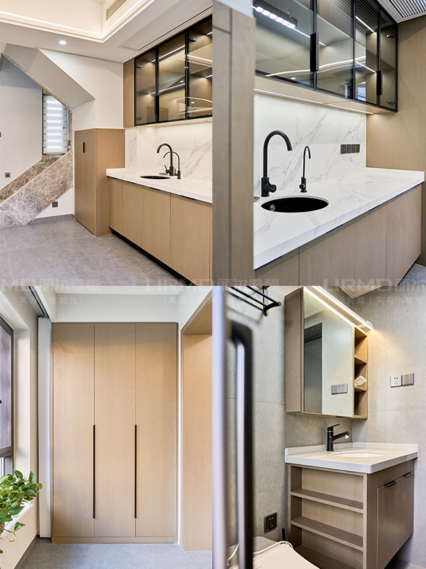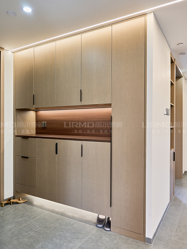柜體采用足18厚杉木芯板,柜門采用LSB板PET膚感柜門,一門到頂,五金使用原裝進口的百隆五金