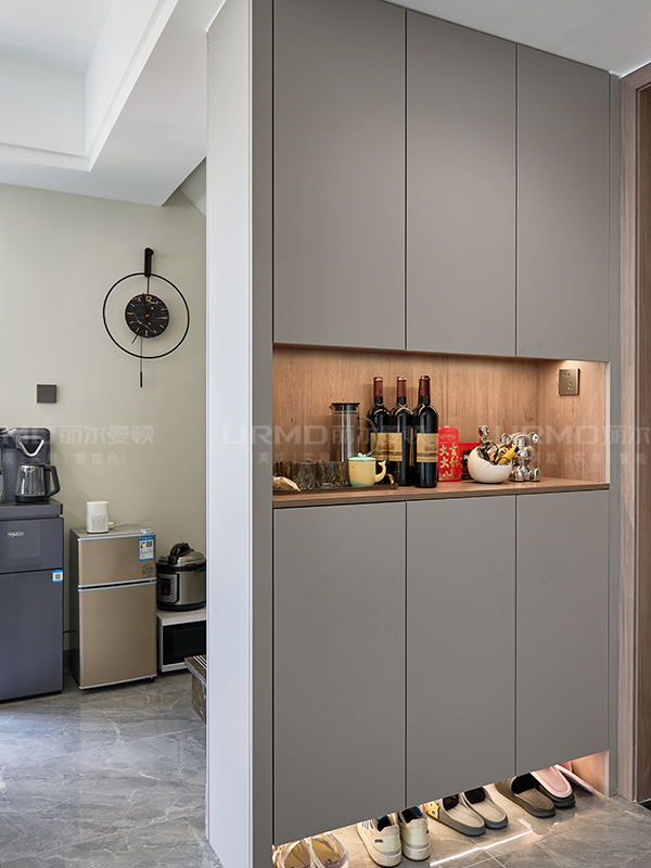 柜體采用足18厚杉木芯板,柜門采用LSB板PET膚感柜門,一門到頂,五金使用原裝進口的百隆五金
