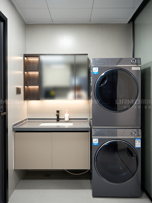 浴室柜+洗漱臺(tái),柜體采用足18厚杉木芯板,柜門(mén)采用LSB板PET膚感柜門(mén),一門(mén)到頂,五金使用原裝進(jìn)口的百隆五金