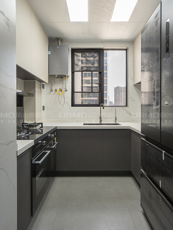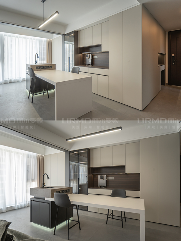 超長到頂餐邊柜、陽臺儲物柜、陽臺家政柜、西廚區中島臺、中廚區u型櫥柜、