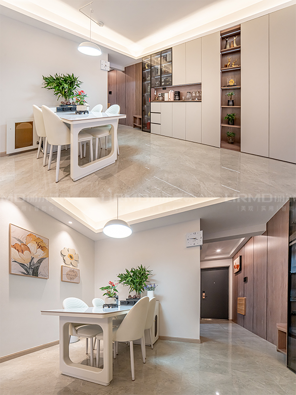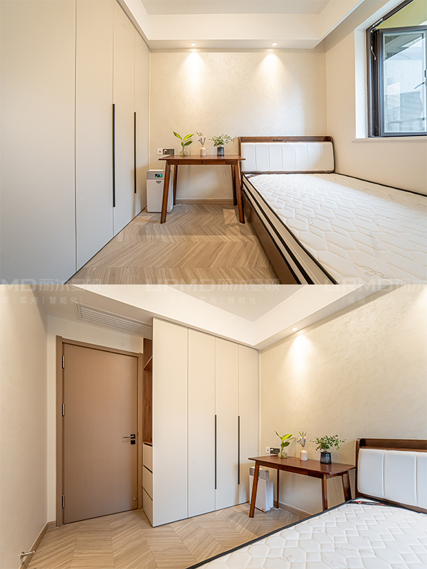 打通客房與客廳后,公共區域空間更加開闊,客廳背景墻調換方向增加儲物空間,