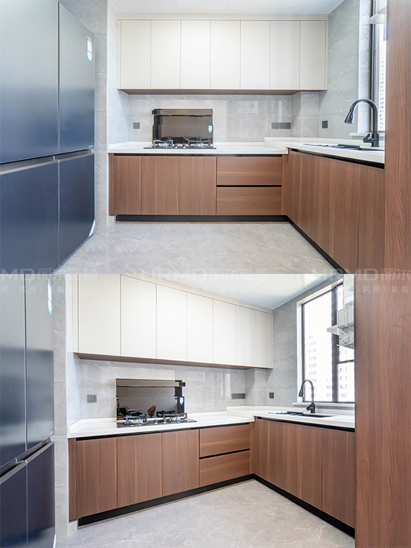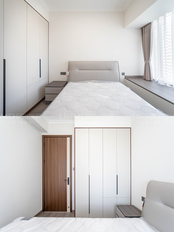高端全屋定制:柜體板材為十環認證的萬象天冠18mm厚杉木芯板、柜門是歐松板雙飾面門、奧地利進口百隆五金。