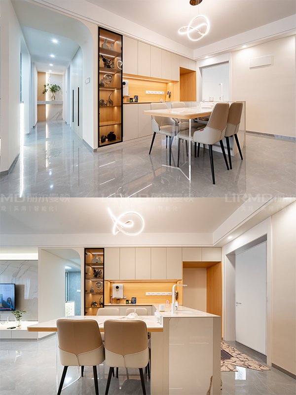 門墻柜一體化設計,打造全屋同款同色同造型,書房運用玻璃柜門的設計,美觀的同時實用感也很絕