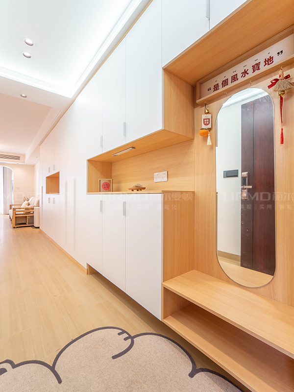 入戶衣帽間設計了換鞋凳、掛衣區、入戶鞋柜,并與餐邊柜做一體式設計,簡潔又大氣??