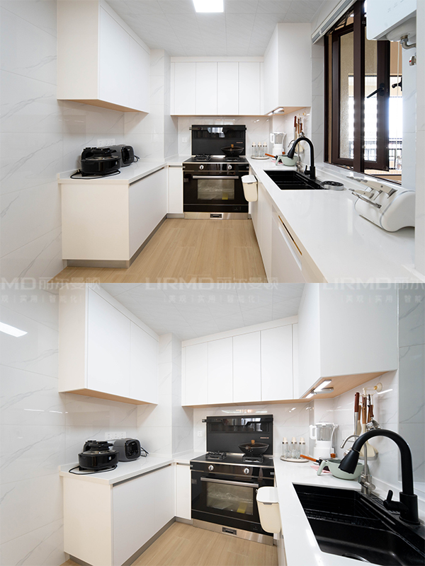 高端全屋定制:柜體板材為十環認證的萬象天冠18mm厚杉木芯板、柜門是歐松板雙飾面門、奧地利進口百隆五金。