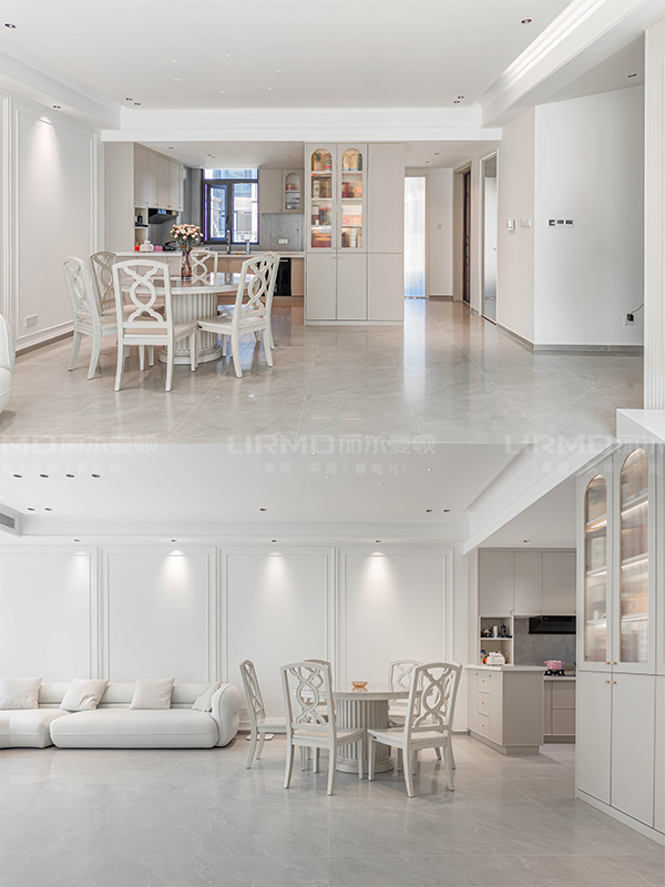 客餐廳是豎廳一體設(shè)計,玄關(guān)用轉(zhuǎn)角柜代替了廚房隔墻,開放式廚房,讓空間更加通透與明亮,