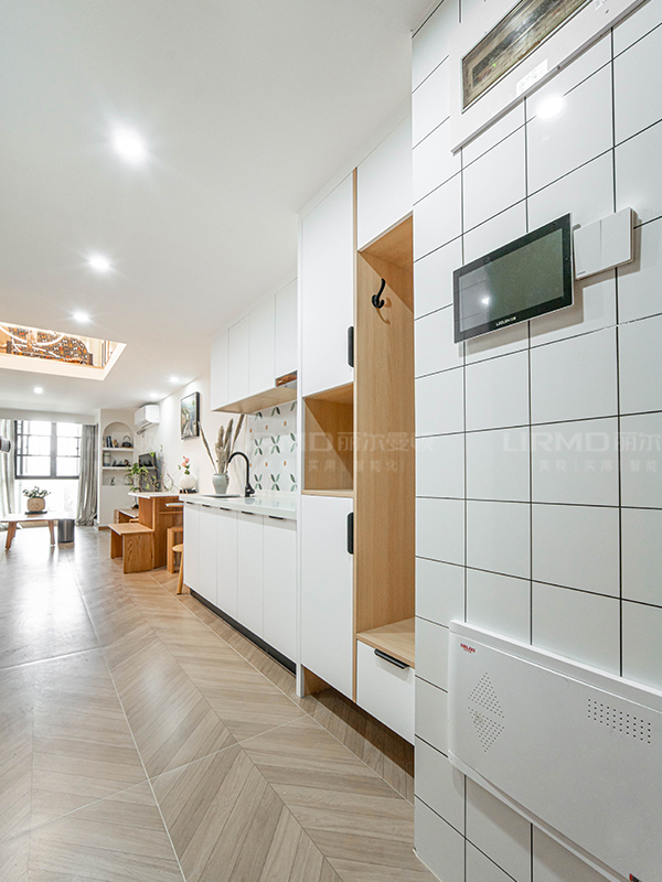 一樓是客廳區,魚骨紋地磚通鋪,全屋原木色搭配白色,電視機旁邊墻面做了弧形鏤空收納區,美觀又實用。