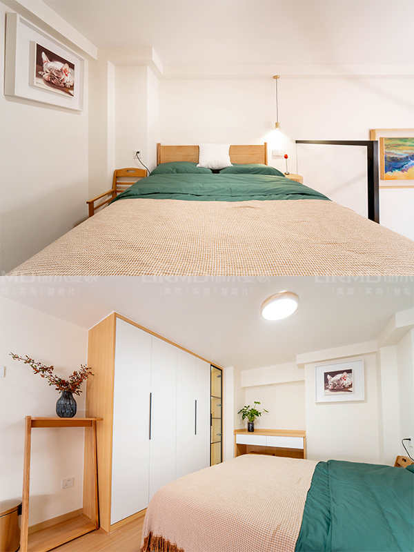 二樓使用與柜子顏色相仿的木地板。床、家具、定制衣柜、書桌都采用原木風,將原木風貫徹到底。