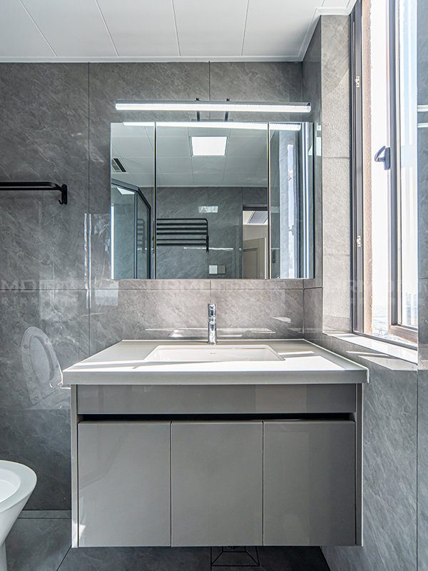 電視背景墻采用巖板裝飾,與整體灰色調相碰撞,更有質感