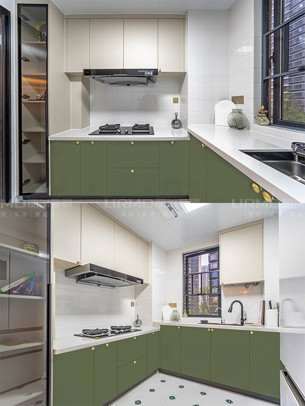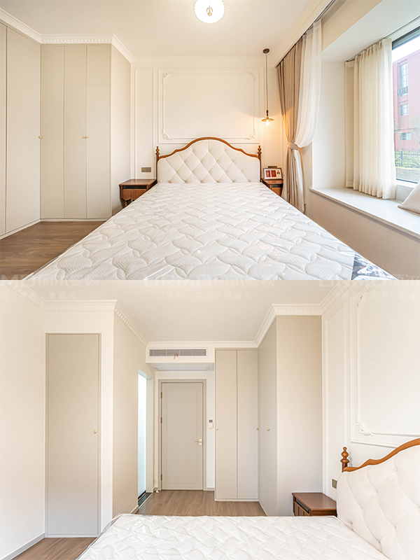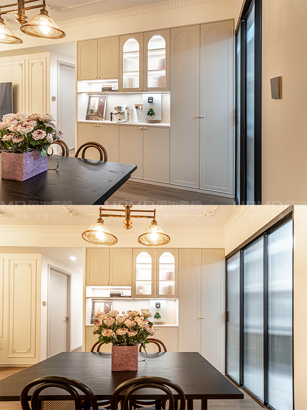 整體定制采用象牙灰加同色系柜門,搭配圓柄金屬拉手,增加了法式的優雅