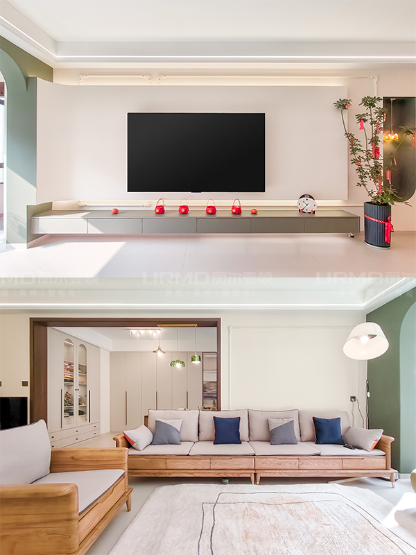 ?弧形電視柜+懸空一字柜設計不顯壓抑,營造輕盈感