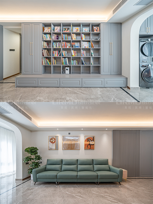 客廳正面書柜+地臺設(shè)計滿足收納展示需求,收納游走在半藏半露間營造出了一種圖書館的沉浸式閱讀空間