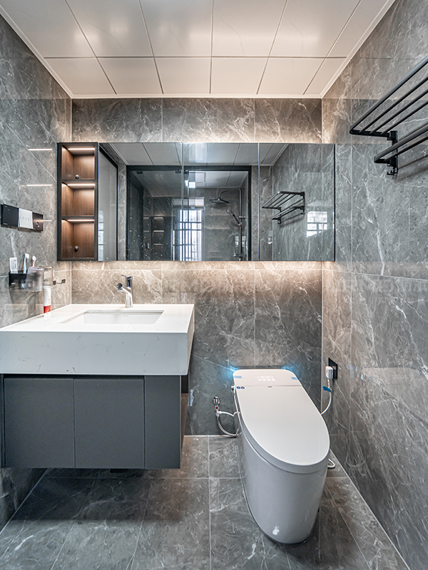 全屋門墻柜一體化定制,采用深咖棕+明亮淺灰的搭配,整體空間既不沉悶又更有層次感