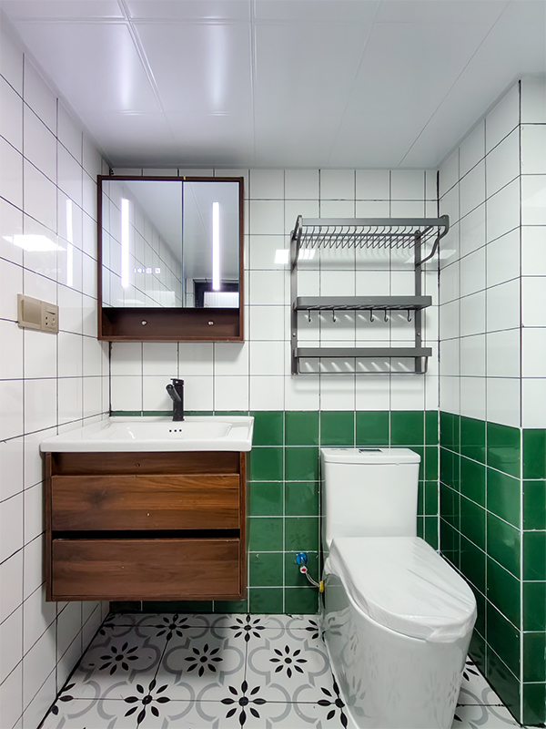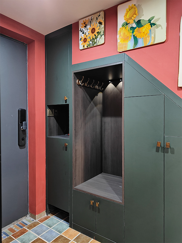 撞色搭配帶來的設計感,精致又復古,木質(zhì)柜與綠植等元素構(gòu)成主要特色