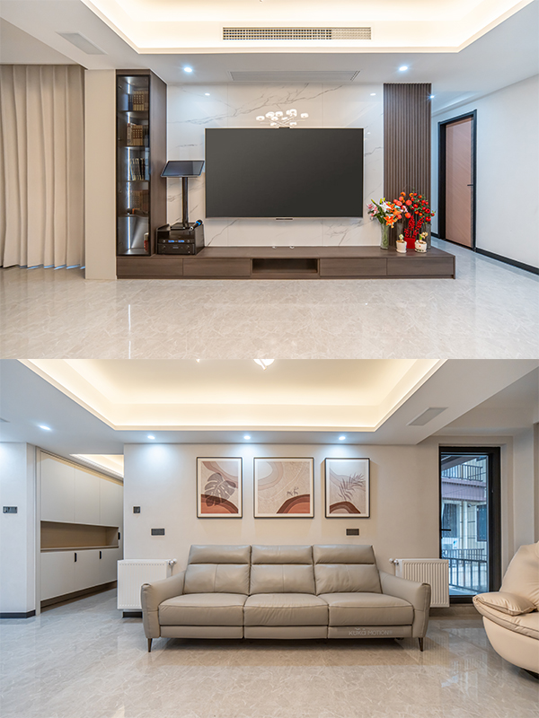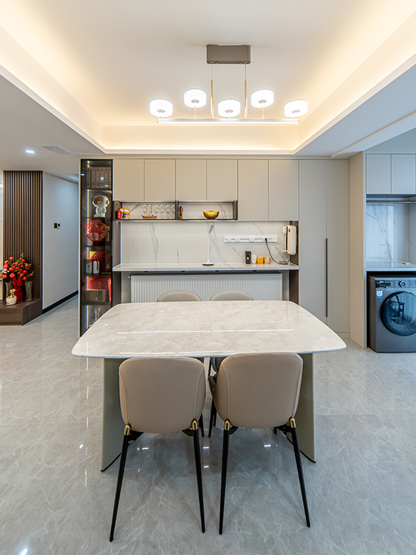 黑白灰的主色調搭配深色木制和燈光的點綴,讓整個家充滿了現代感與溫馨氣息
