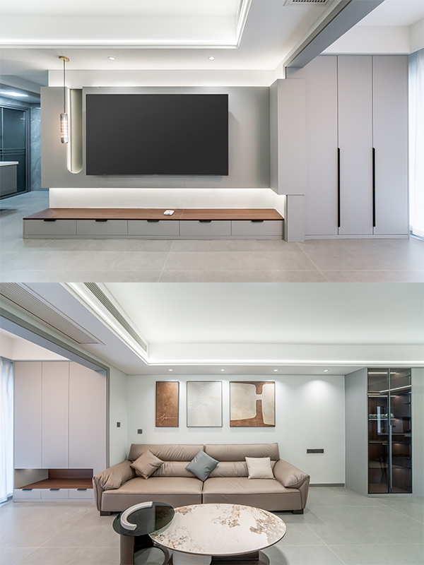 鞋柜結(jié)合裝飾柜一體,加大功能性,讓柜子的美感顯得格外精致,更具空間感有種聯(lián)動性