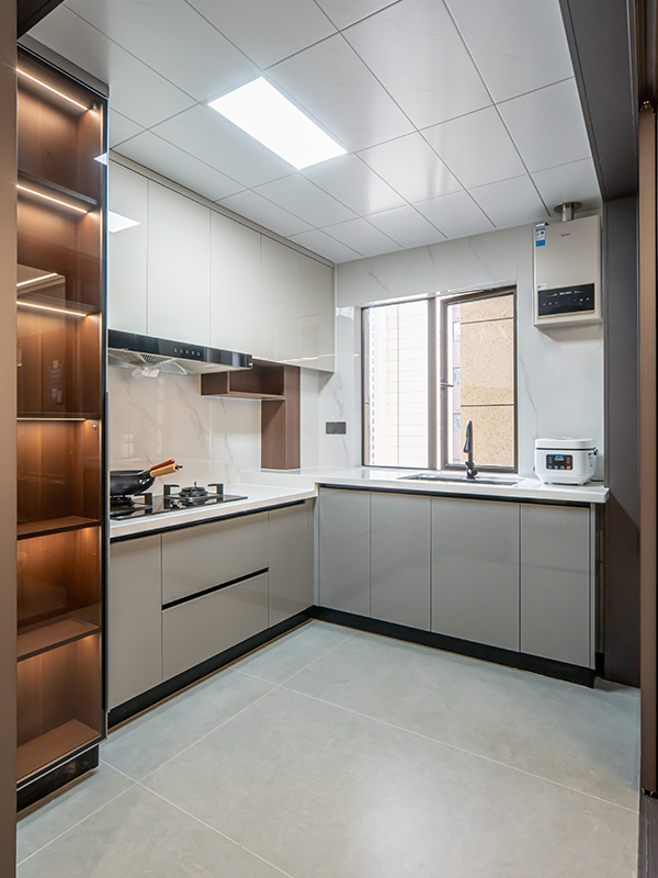開放式餐廚一體化,讓原本單調(diào)乏味的空間添加了互動交流的樂趣,讓業(yè)主在做餐時不再孤立