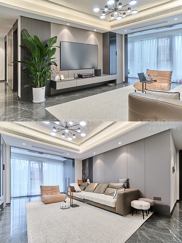 墻板運用同色門板上墻穿插大理石紋路墻板,與暖色燈光相結合,讓沉穩的空間也不失溫馨
