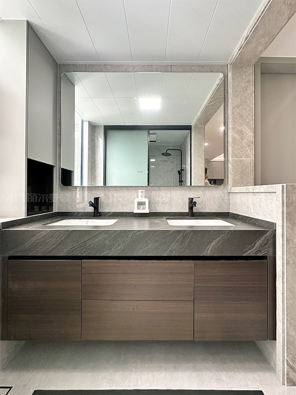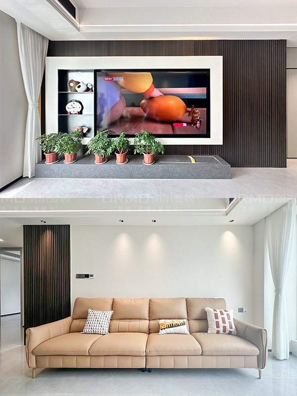 電視背景采用懸浮設計,利用格柵護墻與巖板的搭配,清晰明了的線條,簡單大氣