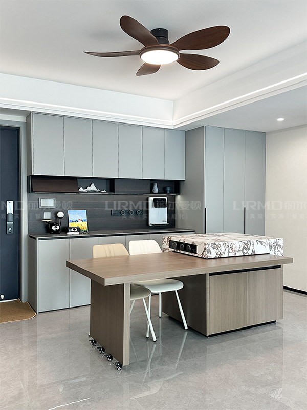 餐島一體的設計,最大化的利用空間,增加普通餐廳的靈活性,島臺表面做巖板一體,美觀又好打理