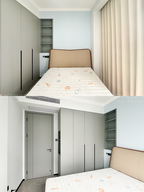 利用格柵隱形門與同色系的木飾面定制,增大電視墻的視覺效果,提高美感擴大空間