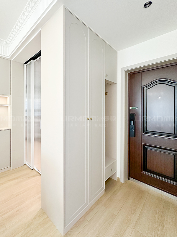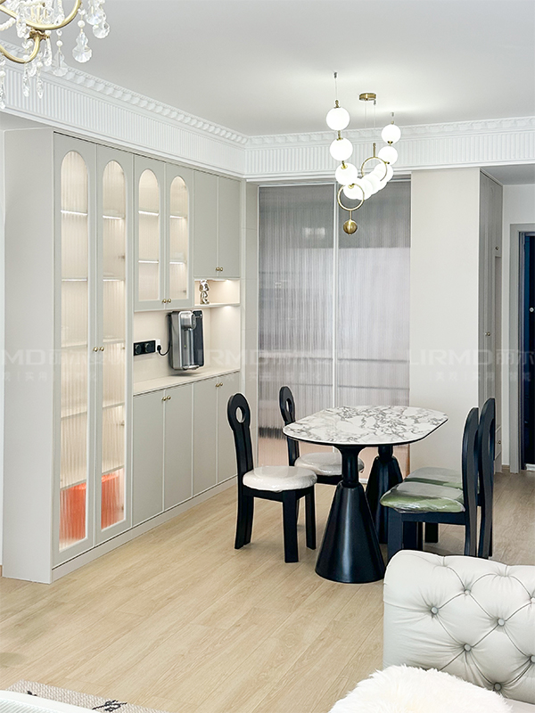 整體是法式裝修風格,采用拱形門板造型以及玻璃門,通過燈帶的襯托下營造出法式的浪漫與唯美