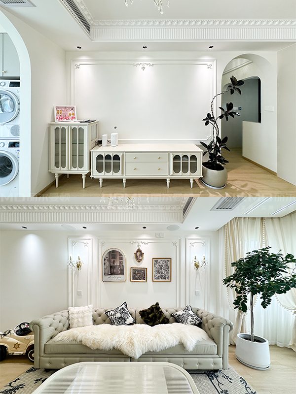 墻上頂上的PU線條、精致的吊燈、柔軟的窗簾以及各種浪漫的裝飾品,讓空間更具法式韻味