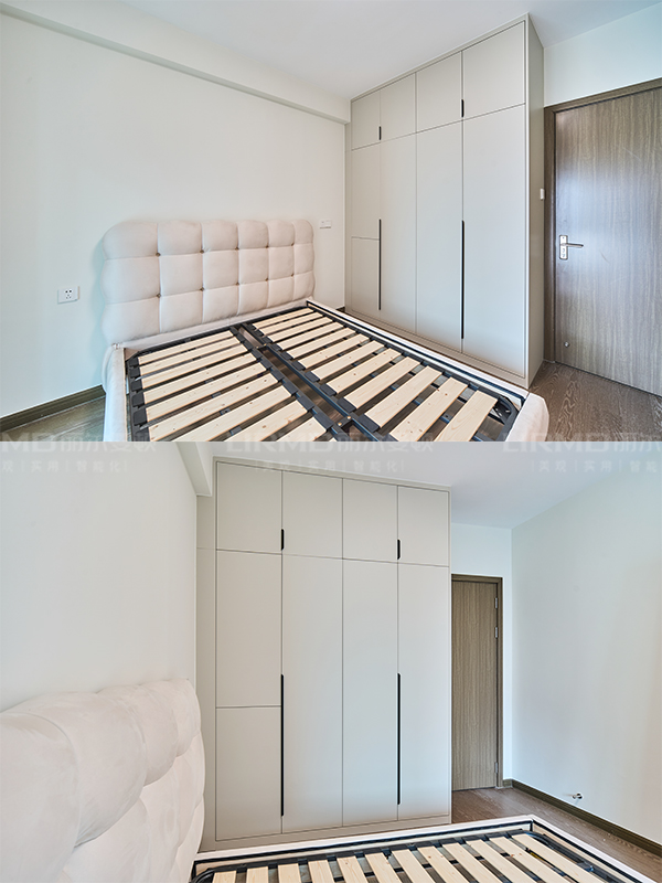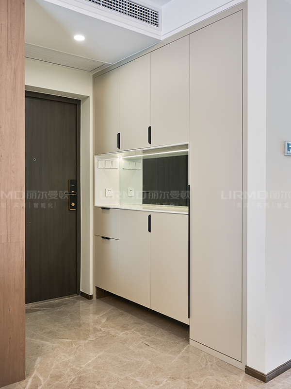 整體定制柜顏色選用濟州灰加象牙灰的撞色搭配,讓整體顏色更加自然清新