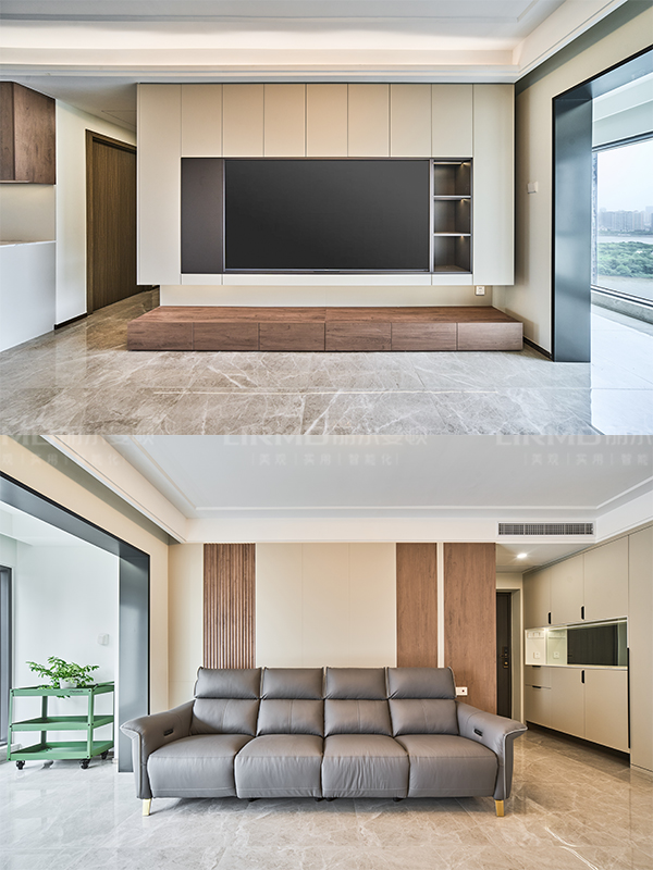 整層電視背景柜,下方中段鏤空搭配燈帶地臺,舒適美觀