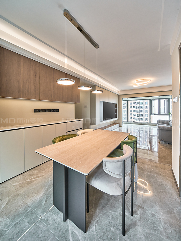 餐邊柜全系無拉手設計搭配金絲橡木的撞色搭配,視覺感官上盡顯盛宴